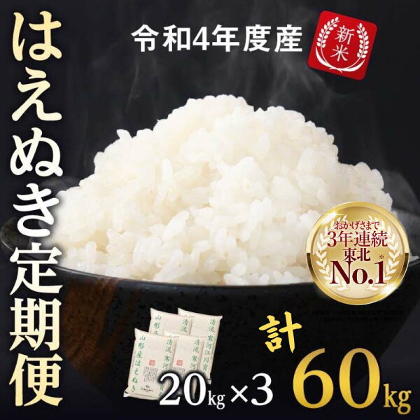 2022年(令和4年)産米をお届けします! ★昨年もさがえ市で人気ダントツ!★ ◎配送時期が選べて安心!ご希望の時期にお届け! ◎一度に20kg届くので、毎日イッパイご飯を食べるご家庭に嬉しい! 「10kgでは足りない!」「もっとたくさん送ってほしい」というご要望にお応えして、山形産はえぬきを20kgでお届けします。 1回で20kg届くのでたくさん炊いても大丈夫!毎食のご飯はもちろん、お弁当や夜食にも山形産はえぬきが楽しめますよ。 ◆先行予約が断然おススメ!◆ 配送時期によってはお申込み多数により受付終了となる場合がございます。 なるべくお早めにお申込みいただきますようお願いいたします。 ■ 寒河江市からのお知らせ ■ 発送時に「発送伝票番号お知らせメール」をお送りしております 寒河江市ではお米の発送時に、発送伝票番号お知らせメールを送らせていただいております。 ※楽天にご登録のメールアドレス宛にお送りしております。寒河江市からのメールをご覧いただくことが可能なアドレスかどうかをご確認の上お申込みください。 必ずご確認ください! ※お米が到着したら必ず箱を開けて、1袋ずつ中をご確認ください。異常や破損等がある場合はすぐに寒河江市ふるさと納税受付センターまでご連絡ください(到着後1週間を経過してからの返品・交換はできませんのでご注意ください)。 ※お米は生鮮食品です。精米後は徐々に食味が落ちますので、同封の「お米の上手な保管方法」をご覧の上、お早めにお召し上がりください。 発送期間内【中旬(11日〜20日頃)、下旬(21日〜末日頃)】に事業者より順次発送されますので、お届けまで今暫くお待ちくださいますようお願いいたします。 ※必ずご確認ください※ ※配送日の指定はできません。 ※配送先を分けたり、配送時期をずらしたりすることはできません。 ※精白米のみでの配送となります。玄米での発送は受付しておりませんので予めご了承ください。 ※美味しく召し上がっていただくため、直射日光を避け風通しのよい冷暗所で保管し、到着後1ヶ月以内の消費をおすすめいたします。 ※ご寄附申込後に配送先が変更になった場合は対応させていただきますので、事前に下記までご連絡をお願いいたします。 ご連絡はこちらまで 寒河江市ふるさと納税受付センター 電話 0237-85-0124 (平日9時から17時まで) FAX 0237-85-0164 E-MAIL furusato@sagae-city.jp お礼の品詳細 名 称 精米 産 地 山形県 品 種 はえぬき 産 年 2022年(令和4年)産 使 用 割 合 単一原料米 内 容 量 計60kg(20kg(5kg×4袋)×3回) 精米年月日 別途袋に記載 賞 味 期 限 冬場:2か月程度 ※お早めにお召し上がりください。 協力事業者 JAさがえ西村山 ★10kgを3回も大好評受付中★ ≪ 2022年(令和4年)産先行受付 ≫ 【先行予約】新米 令和4年産 はえぬき 定期便 計30kg (10kg(5kg×2袋)×3回) 24,000円 ▼まずは2021年産のお米で食べてみたい方はこちら!▼ 便利な5kg×2袋で計10kgお届け! 【2021年産の新米】はえぬき 10kg (5kg×2袋)2021年産 9,000円 ★大人気!はえぬき清流寒河江川育ちの無洗米★ ▼\2021年ついにデビュー/はえぬき無洗米!▼ 2021年産のお米なら!【令和3年産】 無洗米 はえぬき 15kg( 5kg × 3袋 ) 12,000円 ※画像はイメージです。 ※宅配ボックス希望の方は申込みの際、備考欄に「宅配ボックス希望」とご記入ください。 ・ふるさと納税よくある質問はこちら ・寄附申込みのキャンセル、返礼品の変更・返品はできません。あらかじめご了承ください。★2022年産先行予約は★「さがえ市」のはえぬき定期便で!20kg×3回! 隔月配送! ◎配送時期が選べて安心!ご希望の時期にはえぬきをお届け! ◎1か月おきに20kgずつ届くので、毎日たくさんご飯を食べるご家庭にも嬉しい 「10kgでは足りない!」「もっとたくさん送ってほしい」というご要望にお応えして、2022年産はえぬきを20kgずつお届けします。 1回で5kg袋が4袋届くので便利で安心!毎食のご飯はもちろん、お弁当や夜食にも山形産はえぬきが楽しめますよ。 配送時期が選べるから安心! ふるさと納税で頼んだお米が一気に届いて困ったことはありませんか? さがえ市の「山形産はえぬき」ならお米の消費スケジュールに合わせて配送時期が選べるので安心です。 ☆選べる4コース☆ご希望の時期に、隔月20kg(5kg×4袋)を3回、計60kgお届けします。 < 中旬コース > 2022年10月中旬、12月中旬、2023年2月中旬 (各月11日〜20日頃までに順次配送) 2022年11月中旬、2023年1月中旬、3月中旬 (各月11日〜20日頃までに順次配送) < 下旬コース > 2022年10月下旬、12月下旬、2023年2月下旬 (各月21日〜末日頃までに順次配送) 2022年11月下旬、2023年1月下旬、3月下旬 (各月21日〜末日頃までに順次配送) 山形県産はえぬき『清流寒河江川育ち』 とは 米の食味ランキングにおいて、「外観」、「香り」、「味」、「粘り」、「硬さ」などの総合評価で高い評価を得ている米どころ山形の主力品種であり、10年の歳月をかけて研究・育成された山形県オリジナル品種「はえぬき」。 その中で、肥沃な土壌と気象条件に恵まれた西村山