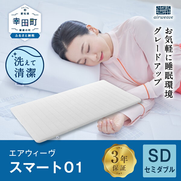 一枚を通して均一の硬さというシンプルな機能で、よりお気軽に快眠をご体感いただけるモデルです。 基本性能である寝返りのしやすさやふわっと身体が浮いたような寝心地、通気性の良さもそのままです。 名称 エアウィーヴ スマート01 セミダブル サイズ 幅120 × 長さ195cm × 厚さ4cm エアファイバーの厚さ:3cm 重さ 約6.5kg 素材 ●カバー ・表面(メッシュ地)=ポリエステル55%・綿45% ・中綿= ポリエステル100% ・裏地=ポリエステル100% ・裏面=ポリエステル100% ●中材(エアファイバー) ・ポリエチレン100% 販売者 株式会社 エアウィーヴ ・ふるさと納税よくある質問はこちら ・商品変更、キャンセル、返品は承れません。予めご了承くださいませ。サイズの確認など事前に行った上でお申込みをお願いいたします。