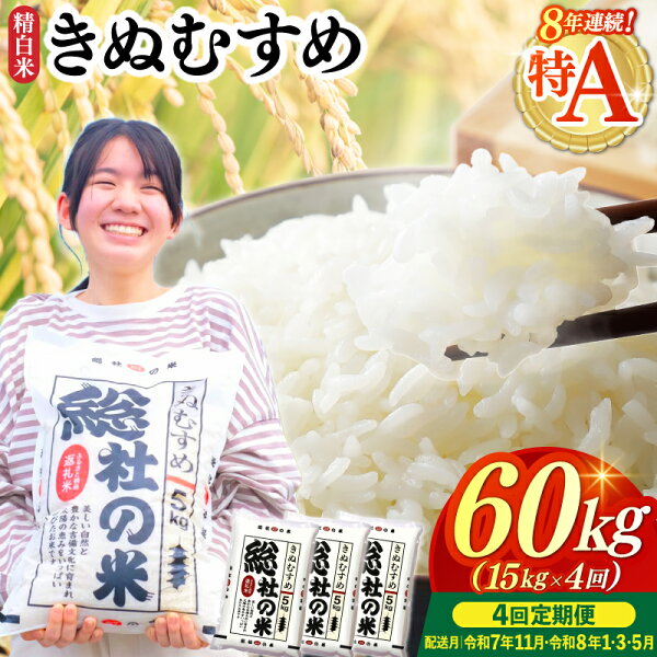 ☆期間・数量限定で申込みを受付します。予定数量に達し次第受付を終了します。 自然豊かで晴れの国の日差しをたっぷり浴びて育ったおいしいお米「そうじゃのお米」。 ご好評いただいております「きぬむすめ」をお届けします。 [提供:そうじゃ地食べ公社(総社市地頭片山)] ※1回の配送につき15kg(精白米5kg×3袋)を4回お送りします。 ※寄付申込みのキャンセル、返礼品の変更・返品はできません。あらかじめご了承ください。 商品説明 名称 精白米 産地 岡山県 品種 きぬむすめ 産年 令和7年産 使用割合 単一原料米 内容量 60kg〔15kg(精白米5kg×3袋)×4回〕 発送時期 各月10日頃から順次発送 精米年月日 別途商品に記載 関連ワード 岡山県 総社 送料無料 お中元 お歳暮 贈り物 ギフト 贈答品 引出物 お返し お取り寄せ 業務用 ふるさと納税 ふるさと 5kg 15kg 5kg×3 60kg 新米 スーパーセール お買い物マラソン 選べる 美味しい お米 小分け 個包装 白米 保存 訳あり 予約 在庫あり 五キロ 十五キロ 六十キロ 手軽 簡単 手間いらず ブランド スーパーセール スーパーSALE ご飯のお供 明太子 辛子明太子 うなぎ 鰻 いくら ホタテ 帆立 鮭 さけ サーモン 刺身 海老 えび うに 雲丹 魚介 海鮮 ※ふるさと納税よくある質問はこちら寄付金の用途について 1.市政全般 2.福祉全般 3.歴史・文化全般 4.環境全般 その他、19の個別事業 受領証明書及びワンストップ特例申請書のお届けについて 入金確認後、注文内容確認画面の【注文者情報】に記載の住所にお送りいたします。 発送の時期は、寄付確認後1週間以内に、お礼の特産品とは別にお送りいたします。 岡山県総社市について 総社市は、その中央部に高梁川が流れ、豊かな自然環境が残る、水とみどりあふれるまちです。また、鬼ノ城をはじめ備中国分寺などの歴史遺産も数多く残っています。現在、総社市では「子育て王国そうじゃ」として子育て支援にも積極的に取り組んでいます。 こうした総社市に対し、「ふるさと総社を良くしたい」、「ふるさと総社を応援したい」という皆さんを「ふるさと総社応援団」として募集しています。そして、皆さんのそういった思いを寄付金という形で実現していただければと考えています。ぜひとも、「ふるさと総社応援団」として、皆さんの思いを総社市にお願いします。
