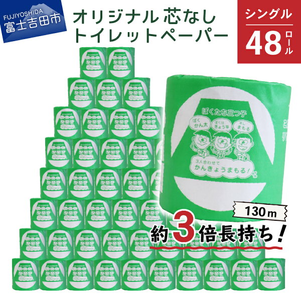 大容量リサイクルトイレットペーパー トイレットペーパーは『環境にやさしい』『大容量』が特徴です。 トイレットペーパー自体、包装紙ともに再生紙100%、また芯無しでゴミが出ず、最後までご使用いただけます。 1ロールあたり130mの巻数、48ロールの梱包で備蓄品としてもオススメです。 【トイレットペーパー3つ子130m48ロール】 静岡県富士宮市の鈴丸紙業を製造メーカーとした弊社オリジナル商品(PB商品)です。 環境にやさしい、エコ重視の観点から商品規格(巻数)、包装紙パッケージ記載内容を富士吉田市役所との共同によって約15年ほど前に商品誕生しました。 富士吉田市役所や一般企業にも広くご愛用いただいています。 ■商品の特徴 1.『環境にやさしい』 包装紙パッケージに記載している「かん太」「きょう平」「まもる」のキャラクター3人で「かんきょうまもる」をアピールしています。 トイレットペーパー自体、包装紙ともに再生紙100%、また芯無しですので芯のゴミが出ず、最後までご使用いただけます。 富士吉田市役所や一般企業にも広くご愛用いただいており、使用後の包装紙の回収・再利用をしております。 ※本ページよりお申し込みいただいた分につきましては、使用後の包装紙の回収は行っておりません。 2.『大容量』 一般のご家庭ではあまり見られない1ロールあたり130mの巻数、48ロールの梱包となっています。 大容量のことから、昨今の防災用備蓄品としてのご評価もお客様よりいただいています。 ■生産者の声 大正7年創業の日用品商社です。 近隣市町村行政機関、観光関連、飲食関連、介護関連等様々な業種のお客様とお取引させていただいています。 『困ったときの松島屋』をキャッチフレーズに皆様の生活の『困った』にお応えしています。 提供元:有限会社 松島屋 商品説明 名称 大容量 長持ちトイレットペーパー 130m シングル 48R 芯なし 内容 再生紙100%トイレットペーパー(シングル) 130m 48ロール芯無し 原材料 再生紙100% サイズ 本体サイズ:幅114mm×長さ130m 外装サイズ:幅450mm×高さ350mm×奥行450mm 重さ13.5kg 穴の直径:約30.3mm 発送期日 ご希望の発送月をお選びください。 ※各月発送となりますが、決済状況に応じては指定月に配送できない場合もありますので予めご承知ください。 提供元 有限会社 松島屋 注意事項 ※本ページよりお申し込みいただいた分につきましては、使用後の包装紙の回収は行っておりません。 ・ふるさと納税よくある質問はこちら ・寄付申込みのキャンセル、返礼品の変更・返品はできません。あらかじめご了承ください。