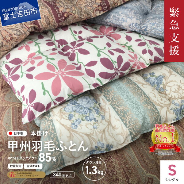 甲州羽毛ふとんは、三冠達成!!(※日本トレンドリサーチ調べ) ・羽毛ふとん品質満足度No.1 ・羽毛ふとん口コミ満足度No.1 ・欲しい羽毛ふとんNo.1 訳ありですが、良質なホワイトダックダウン85%をたっぷり増量1.3kg使用!!「ダウンパワー数値」は340以上の高品質な羽毛ふとんです。 新型コロナウイルスの影響により、注文が激減しがわ生地在庫が余っています。 がわ生地の色・柄の指定はできませんが、中身の羽毛は良質なダウンをたっぷりと増量しています。 今だけの数量限定の返礼品です。 皆さまのご支援どうぞよろしくお願いいたします。 ◆今だけの訳あり企画商品◆ 1.新型コロナウィルスの影響で注文数が激減!!契約キャンセルが続出し在庫が多数ございます。 2.側生地は、契約キャンセル品や廃番品を使用しているため、色・柄の指定はできかねます。 3.今だけの限定商品となります。 ※数量限定品となりますので、ぜひこの機会にお試しください。 ●中身の羽毛は豊富な天然水で磨かれ、清潔さを示す数値は一般的な基準の倍以上!!そうした清潔な羽毛を使用し、熟練の職人が一枚一枚丁寧に仕上げています。 ●側生地は軽量なポリエステル交織の高密度生地を使用!!防ダニ材を使わずにダニの侵入をブロックします。 ●羽毛は世界の名産地より選び抜いた良質なホワイトダックダウン85%をたっぷり増量し1.3kg使用!!立体キルト仕上げのため、真冬も温かくご使用いただけます。8ヶ所ループ付でカバーの取り付けも楽です。 ●羽毛の温かさの目安となる「ダウンパワー数値」は340以上の高品質な羽毛ふとんです。 収納に便利な不織布ケースに入れてお届けいたします。 【布団の種類】 本掛け(厚手タイプ) 寒がり・寒冷地・厚めの掛けふとんをお好みのかたにオススメです。 【側生地】 側生地は軽量なポリエステル交織の高密度生地を使用。防ダニ材を使わずダニの侵入をブロックします。 【詰め物】 世界の名産地より選び抜いた良質なホワイトダックダウン85%をたっぷり1.3kg使用しております。 提供元:有限会社タキ・リビング 商品説明 名称 【数量限定!緊急支援品 訳あり】甲州羽毛ふとん 本掛けふとんダウン85%増量1.3kg (シングル/お任せ柄) 内容 ■羽毛本掛けふとん(シングル)×1枚 ※収納用の専用ケースに入れてお届けします。 サイズ:150x210cm 詰め物:ホワイトダックダウン85%・フェザー15% 重 量:1,300g 生 地:ポリエステル85%綿15% 洗 濯:洗濯絵表示をご確認ください 配送 ご希望の発送月をお選びください。 ※各月発送となりますが、決済状況に応じては指定月に配送できない場合もありますので予めご承知ください。 注意事項/その他 ※在庫品と明記しておりますが、受注後の生産となりますのでご安心ください。 ※色・柄のご指定はできません。 ※思っていた色・柄ではなかったの理由で交換・返品はお受けできません。 ※全て当社の品質基準をクリアしたA品となります。 ※羽毛は動物性の天然素材のため、出来立ての羽毛布団は多少特有のニオイがすることがあります。また、羽毛布団専用バッグや、生地の加工によるニオイが残っている場合もありますが、天日干しやご使用いただくうちに徐々に薄くなりますので、ご安心ください。 提供元 有限会社 タキ・リビング ・ふるさと納税よくある質問はこちら ・寄付申込みのキャンセル、返礼品の変更・返品はできません。あらかじめご了承ください。地域のプロジェクトをみんなで応援!楽天ふるさと納税クラウドファンディング 新たな富士吉田市の玄関口を、富士山信仰と甲斐絹の歴史を伝える文化継承の拠点としたい! 目標金額 300,000,000 円 募集期間: 2021/11/12(金)10:00〜2022/2/10(木)9:59 プロジェクト詳細 本ページのお礼の品は、クラウドファンディング対象です。寄付金は、該当プロジェクトの支援金として利用されます。